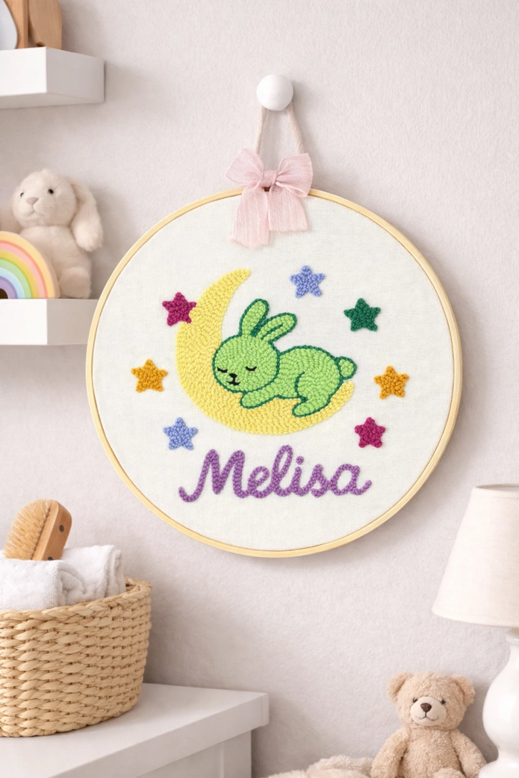 Zenessa’nın özel el işçiliği koleksiyonundan Ay & Tavşan Temalı Punch Nakış Pano, sevimli ay ve tavşan figürleriyle tasarlanmış, isme özel olarak hazırlanan dekoratif bir duvar panosudur. Yumuşak punch dokusu, doğal pamuk kumaşı ve kişiye özel nakışıyla hem modern hem de duygusal bir hediye alternatifi sunar.