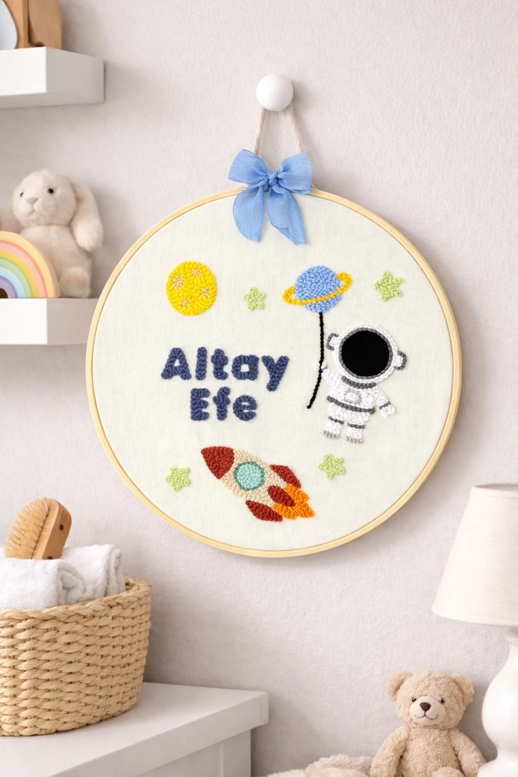 Zenessa Uzay Temalı Punch Nakış Pano, tamamen el işçiliğiyle hazırlanan, isme özel olarak kişiselleştirilebilen premium dekoratif bir üründür. Uzay temalı sevimli tasarımı, yumuşak dokulu pamuk punch ipleri ve doğal kumaş yüzeyi ile hem bebek odası dekorasyonuna hem de özel gün hediyelerine zarif bir anlam katar.