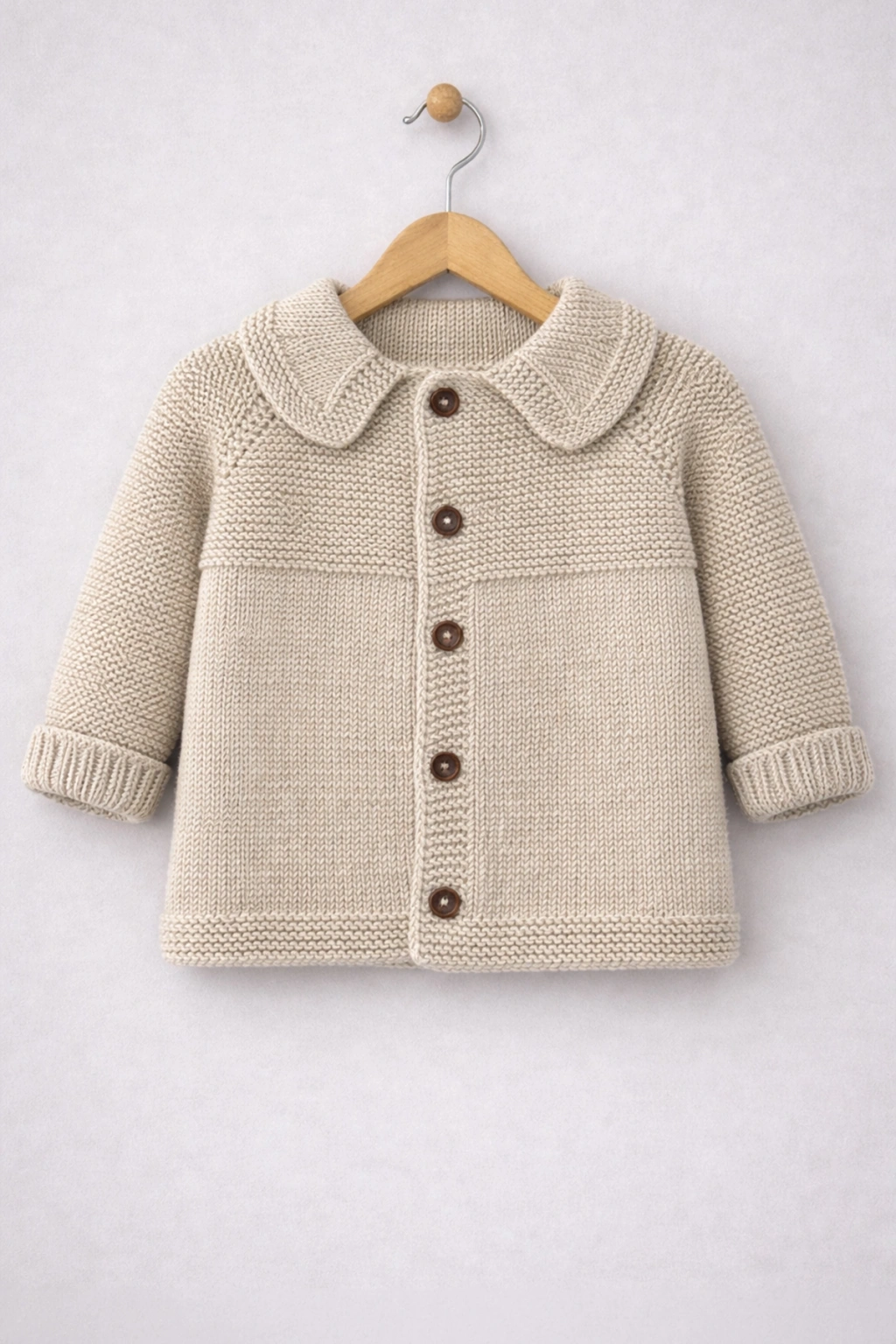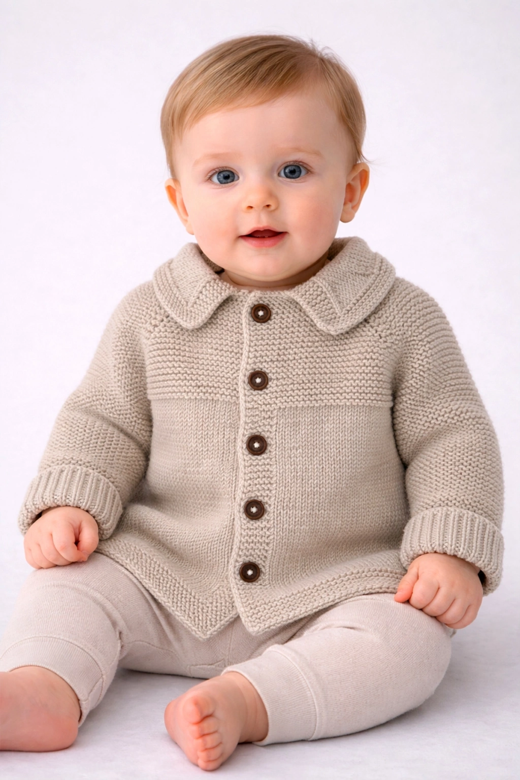 Şık bebe yaka detayı ve doğal tonlardaki düğmeleri ile sade ama dikkat çekici bir stil sunan bu örgü bebek hırkası, hem günlük kombinlerde hem de özel anlarda rahatlıkla tercih edilebilir. Unisex tasarımı sayesinde kız ve erkek bebekler için uygun olup gardırobun vazgeçilmez parçalarından biridir.